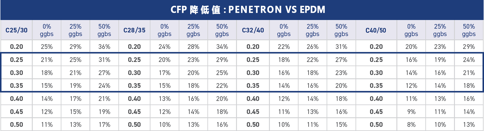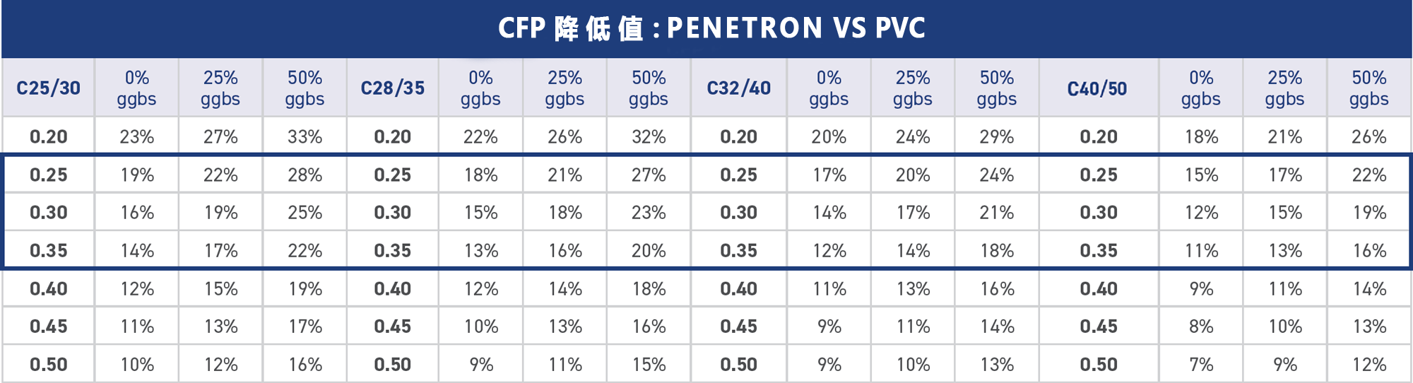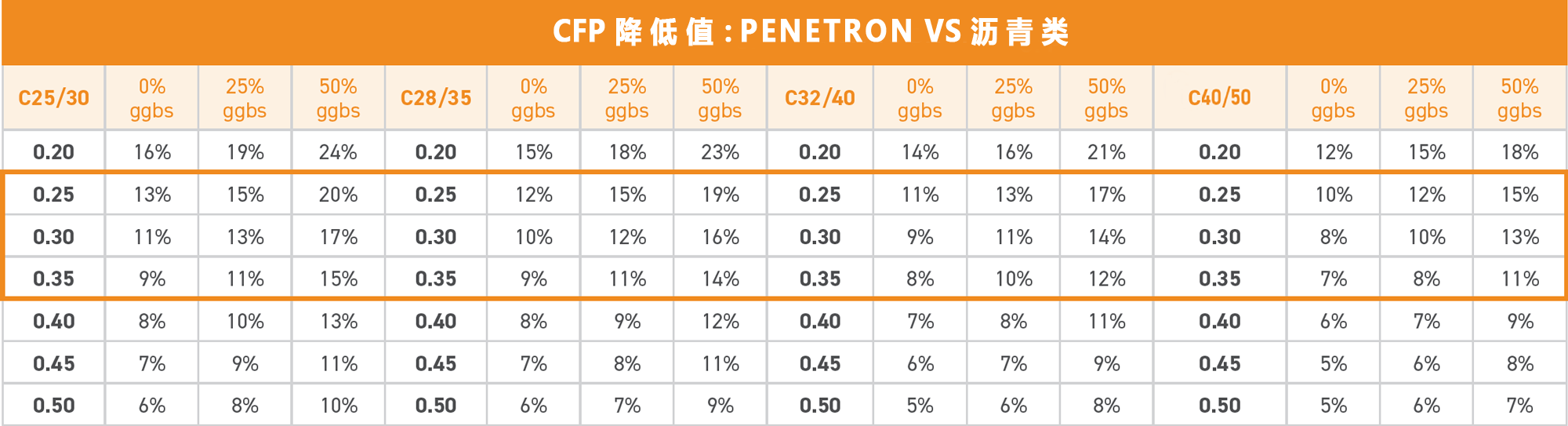 按照結(jié)構(gòu)平均厚度0.25-0.35m計(jì)算每平方米混凝土的CFP,將PENETRON ADMIX 澎內(nèi)傳混凝土防水添加劑(PNC803)與上述表面處理方案進(jìn)行比較?,結(jié)果見右表。