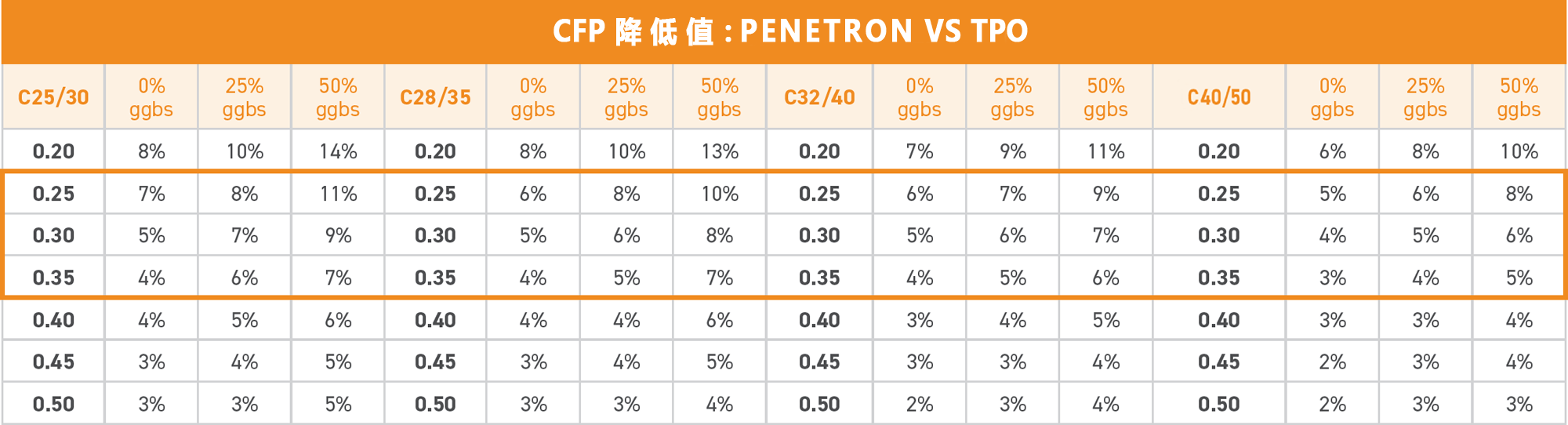 按照結(jié)構(gòu)平均厚度0.25-0.35m計(jì)算每平方米混凝土的CFP,將PENETRON ADMIX 澎內(nèi)傳混凝土防水添加劑(PNC803)與上述表面處理方案進(jìn)行比較?,結(jié)果見右表。